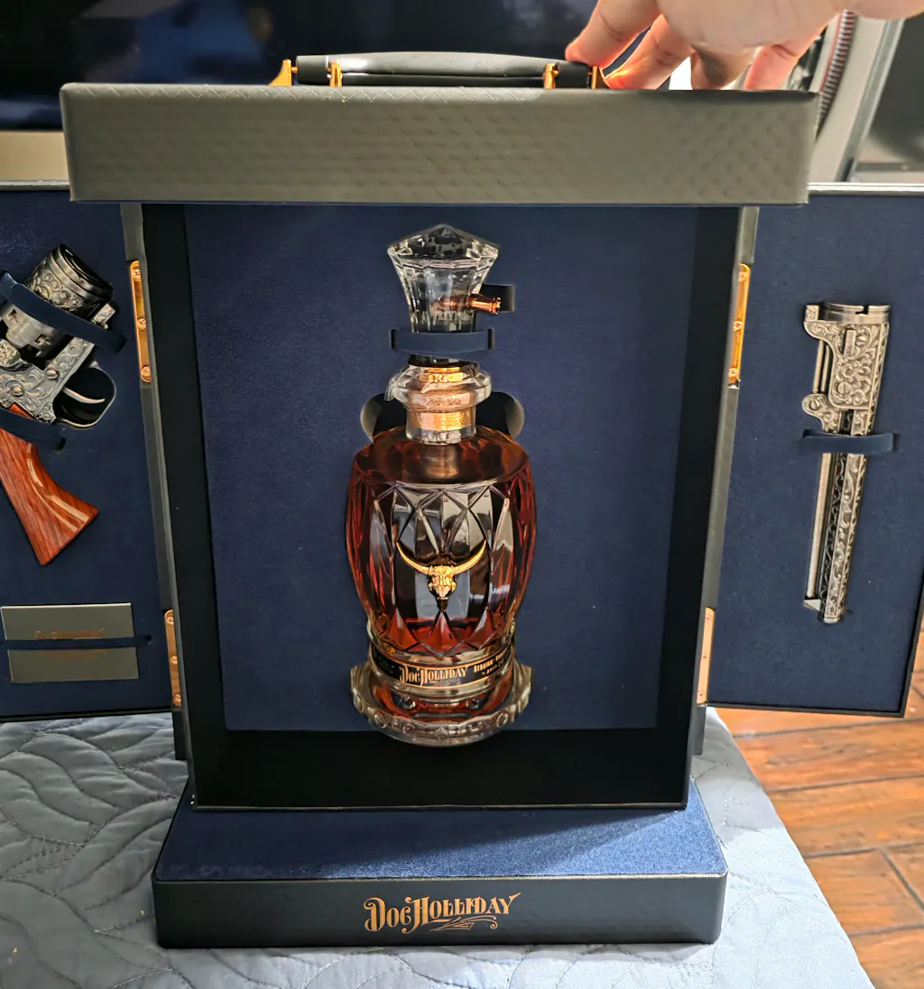 The Doc Holliday 10-Year-Old Special Edition is where patience meets presentation. A full decade of aging has created bourbon with soul—complex, distinctive, unforgettable. It's honored with packaging worthy of the craft: a museum-quality wooden case, a decanter built to become an heirloom, and a revolver cork stopper that's equal parts art and conversation starter.